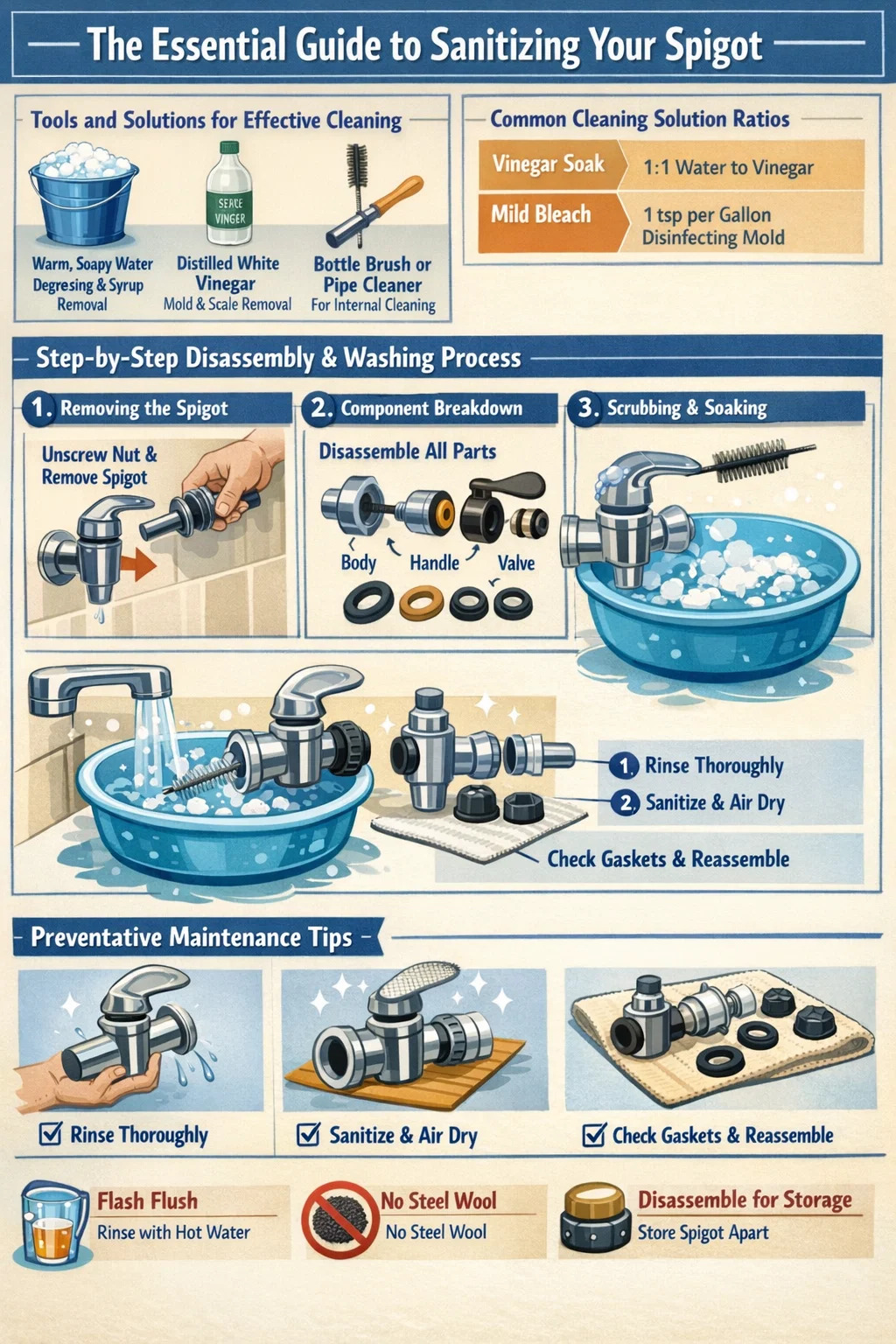Chun sábháilteacht bia a chothabháil agus fás baictéir dhochracha a chosc, a spigot dáileoir dí ba chóir a bheith domhain-ghlanadh tar éis gach úsáid nó ar a laghad uair sa tseachtain má úsáidtear é le haghaidh gnáthuisce. Toisc go bhfuil bealaí inmheánacha casta ag spigots, ní leor an taobh amuigh a shruthlú go simplí; tá díchumhachtú iomlán ag teastáil chun iarmhair ghreamaitheacha siúcra a bhaint agus spóir mhúnlaigh a éiríonn i dtimpeallachtaí dorcha, tais.