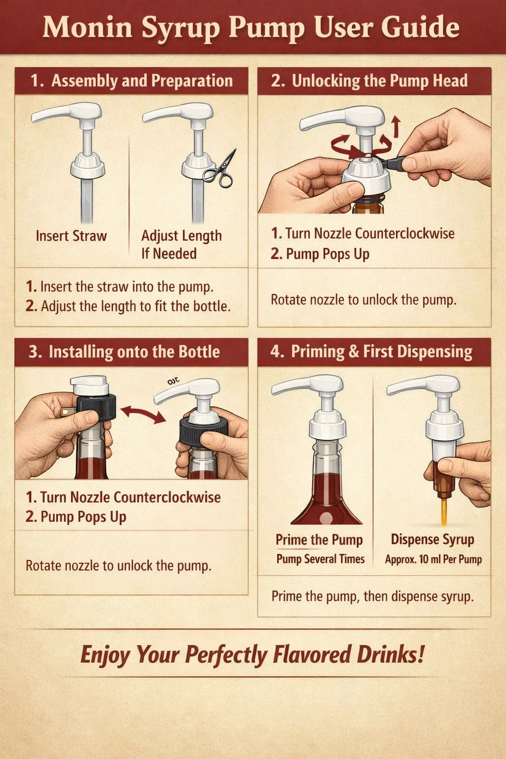 Rialú na coda: Chomh luath agus a shreabhann an síoróip, má bhrúnn tú an caidéal an bealach síos go hiondúil déantar méid seasta caighdeánach a dháileadh (de ghnáth déanann caidéil chaighdeánacha Monin thart ar 10 ml in aghaidh an phreasa a dháileadh, ag brath ar an múnla).