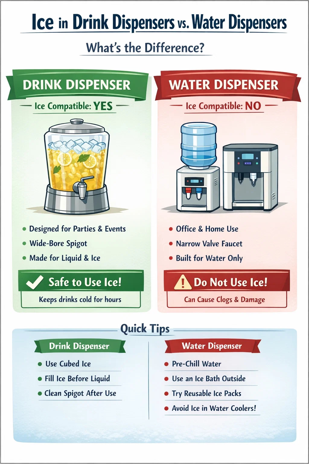 Maidir le dáileoirí dí saintógtha — an cineál a dhíoltar i siopaí soláthair bialainne, siopaí cóisire ar cíos, agus miondíoltóirí earraí cistine — ní hamháin go bhfuil oighear inghlactha, táthar ag súil. De ghnáth déantar na haonaid seo as plaisteach, aicrileach nó cruach dhosmálta saor ó BPA le hoscailtí béal leathan agus spigots faucet deartha chun leacht a chur timpeall nó trí oighear leáite go páirteach gan clogging.