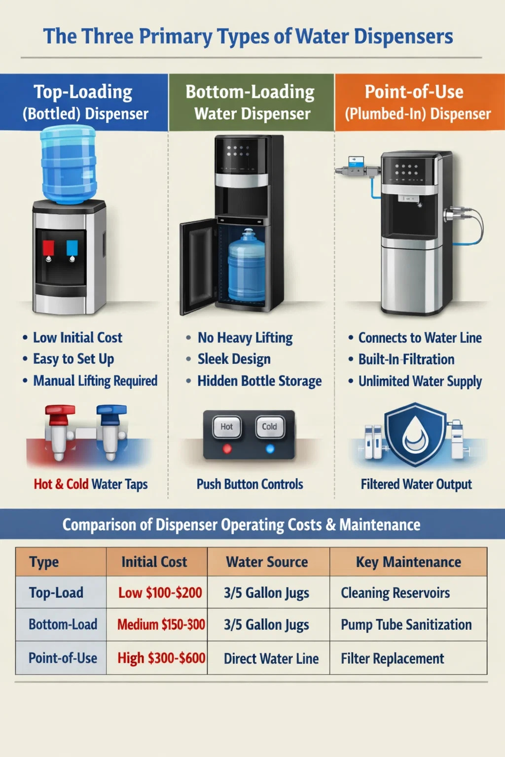 Agus réitigh hiodráitithe á meas do theach nó d’oifig, déantar dáileoirí uisce a chatagóiriú go ginearálta i dtrí chineál ar leith bunaithe ar a meicníocht lódála agus a bhfoinse uisce: Dáileoirí Barr-Lódála (Buidéil), Dáileoirí Bun-Lódála, agus Dáileoirí Pointe Úsáide (Pluiméireachta). Úsáideann gach córas córas sonrach faucet dáileoir uisce cumraíocht chun sreabhadh a bhainistiú, agus a roghnú an ceann ceart ag brath ar do spás fisiciúil, buiséad, agus leibhéal cothabhála inmhianaithe.